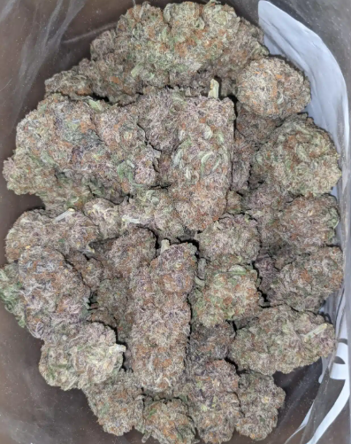 These buds show up with deep purple running through them—not just a hint, but streaks that make you double-take. Dense, properly cured, and covered in enough trichomes to catch the light.